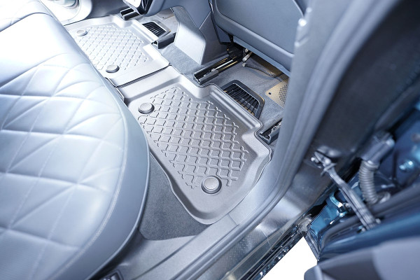 Protezione >  La miscela in termoplastica TPE di alta qualità e la forma a rialzo assicurano una protezione completa. I bordi del set sono alti per prevenire la fuoriuscita di liquidi e della sporcizia, mantenendoli all'interno dei tappetini. Il piano sottostante rimane così asciutto e pulito, eliminando il rischio di cattivi odori e muffe. Designed in Italy, Made in EU. I tappetini sono appositamente progettati per resistere ai raggi UV, alle temperature elevate e ai graffi.