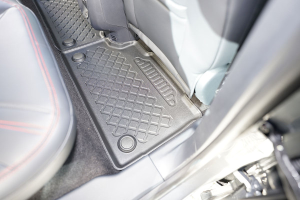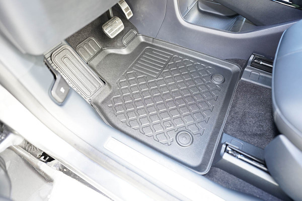 Confort> Il materiale è resistente, non emana cattivi odori e si può riciclare. Il fondo antiscivolo mantiene il set saldamente in posizione, offrendoti un comfort ottimale durante la guida della tua Ford Mustang Mach-E 2020-. Se previsto dal costrutture, vengono forniti anche dei sistemi di fisaggio da installare.