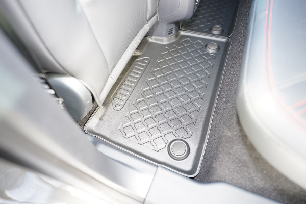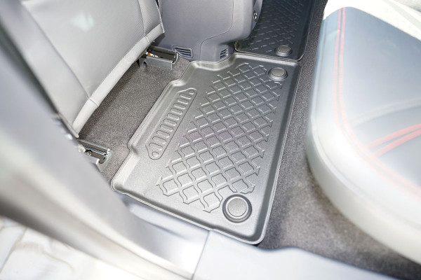 Protezione >  La miscela in termoplastica TPE di alta qualità e la forma a rialzo assicurano una protezione completa. I bordi del set sono alti per prevenire la fuoriuscita di liquidi e della sporcizia, mantenendoli all'interno dei tappetini. Il piano sottostante rimane così asciutto e pulito, eliminando il rischio di cattivi odori e muffe. Designed in Italy, Made in EU. I tappetini sono appositamente progettati per resistere ai raggi UV, alle temperature elevate e ai graffi.