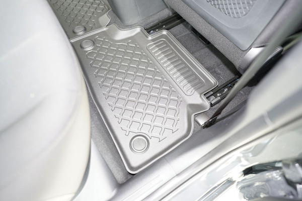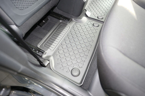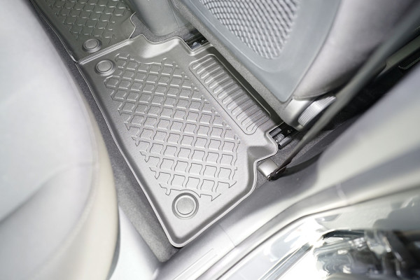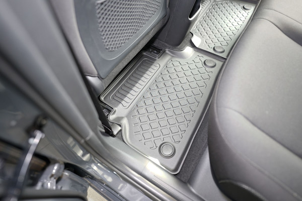 Confort> Il materiale è resistente, non emana cattivi odori e si può riciclare. Il fondo antiscivolo mantiene il set saldamente in posizione, offrendoti un comfort ottimale durante la guida della tua Hyundai Kona Electric 2023-. Se previsto dal costrutture, vengono forniti anche dei sistemi di fisaggio da installare.