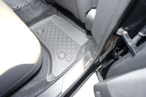 Protezione >  La miscela in termoplastica TPE di alta qualità e la forma a rialzo assicurano una protezione completa. I bordi del set sono alti per prevenire la fuoriuscita di liquidi e della sporcizia, mantenendoli all'interno dei tappetini. Il piano sottostante rimane così asciutto e pulito, eliminando il rischio di cattivi odori e muffe. Designed in Italy, Made in EU. I tappetini sono appositamente progettati per resistere ai raggi UV, alle temperature elevate e ai graffi.