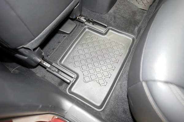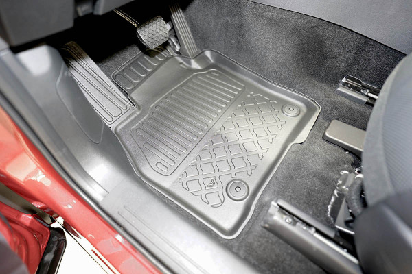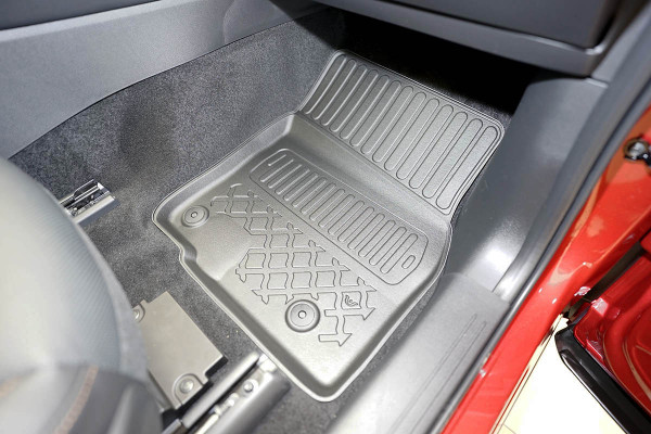 Protezione >  La miscela in termoplastica TPE di alta qualità e la forma a rialzo assicurano una protezione completa. I bordi del set sono alti per prevenire la fuoriuscita di liquidi e della sporcizia, mantenendoli all'interno dei tappetini. Il piano sottostante rimane così asciutto e pulito, eliminando il rischio di cattivi odori e muffe. Designed in Italy, Made in EU. I tappetini sono appositamente progettati per resistere ai raggi UV, alle temperature elevate e ai graffi.