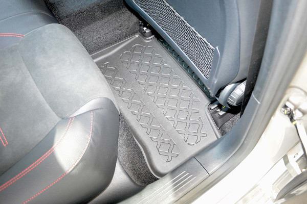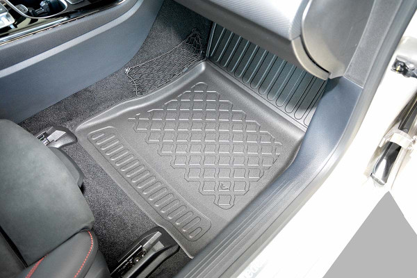 Protezione >  La miscela in termoplastica TPE di alta qualità e la forma a rialzo assicurano una protezione completa. I bordi del set sono alti per prevenire la fuoriuscita di liquidi e della sporcizia, mantenendoli all'interno dei tappetini. Il piano sottostante rimane così asciutto e pulito, eliminando il rischio di cattivi odori e muffe. Designed in Italy, Made in EU. I tappetini sono appositamente progettati per resistere ai raggi UV, alle temperature elevate e ai graffi.