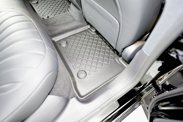 Protezione >  La miscela in termoplastica TPE di alta qualità e la forma a rialzo assicurano una protezione completa. I bordi del set sono alti per prevenire la fuoriuscita di liquidi e della sporcizia, mantenendoli all'interno dei tappetini. Il piano sottostante rimane così asciutto e pulito, eliminando il rischio di cattivi odori e muffe. Designed in Italy, Made in EU. I tappetini sono appositamente progettati per resistere ai raggi UV, alle temperature elevate e ai graffi.