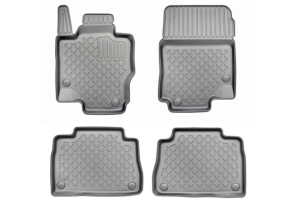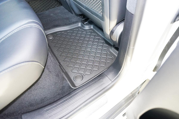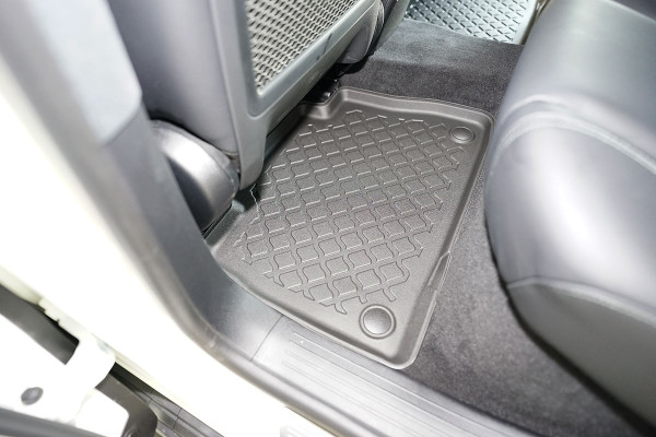 Protezione >  La miscela in termoplastica TPE di alta qualità e la forma a rialzo assicurano una protezione completa. I bordi del set sono alti per prevenire la fuoriuscita di liquidi e della sporcizia, mantenendoli all'interno dei tappetini. Il piano sottostante rimane così asciutto e pulito, eliminando il rischio di cattivi odori e muffe. Designed in Italy, Made in EU. I tappetini sono appositamente progettati per resistere ai raggi UV, alle temperature elevate e ai graffi.