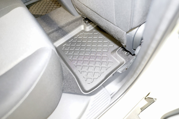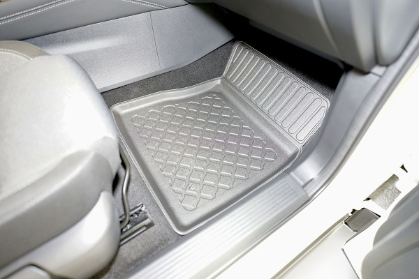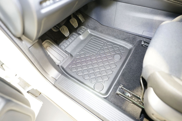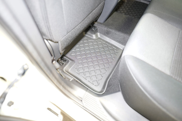Protezione >  La miscela in termoplastica TPE di alta qualità e la forma a rialzo assicurano una protezione completa. I bordi del set sono alti per prevenire la fuoriuscita di liquidi e della sporcizia, mantenendoli all'interno dei tappetini. Il piano sottostante rimane così asciutto e pulito, eliminando il rischio di cattivi odori e muffe. Designed in Italy, Made in EU. I tappetini sono appositamente progettati per resistere ai raggi UV, alle temperature elevate e ai graffi.