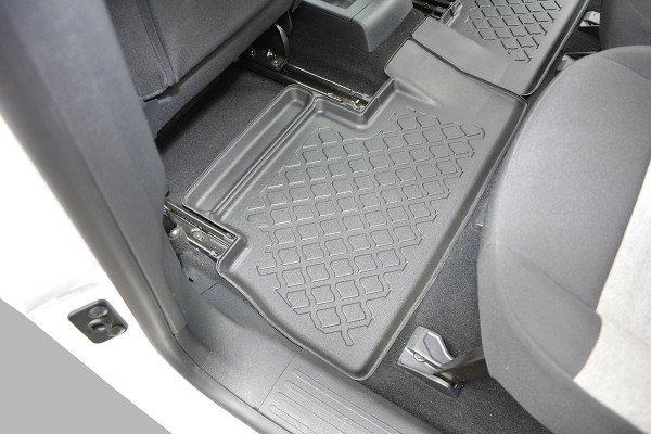 Protezione >  La miscela in termoplastica TPE di alta qualità e la forma a rialzo assicurano una protezione completa. I bordi del set sono alti per prevenire la fuoriuscita di liquidi e della sporcizia, mantenendoli all'interno dei tappetini. Il piano sottostante rimane così asciutto e pulito, eliminando il rischio di cattivi odori e muffe. Designed in Italy, Made in EU. I tappetini sono appositamente progettati per resistere ai raggi UV, alle temperature elevate e ai graffi.