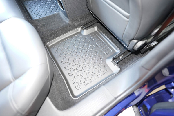 Protezione >  La miscela in termoplastica TPE di alta qualità e la forma a rialzo assicurano una protezione completa. I bordi del set sono alti per prevenire la fuoriuscita di liquidi e della sporcizia, mantenendoli all'interno dei tappetini. Il piano sottostante rimane così asciutto e pulito, eliminando il rischio di cattivi odori e muffe. Designed in Italy, Made in EU. I tappetini sono appositamente progettati per resistere ai raggi UV, alle temperature elevate e ai graffi.