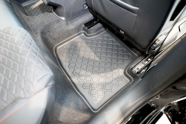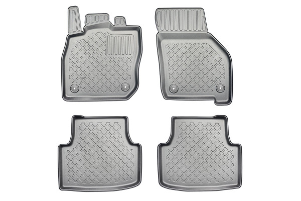 Protezione >  La miscela in termoplastica TPE di alta qualità e la forma a rialzo assicurano una protezione completa. I bordi del set sono alti per prevenire la fuoriuscita di liquidi e della sporcizia, mantenendoli all'interno dei tappetini. Il piano sottostante rimane così asciutto e pulito, eliminando il rischio di cattivi odori e muffe. Designed in Italy, Made in EU. I tappetini sono appositamente progettati per resistere ai raggi UV, alle temperature elevate e ai graffi.