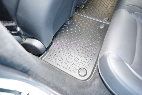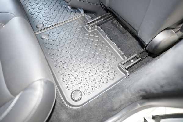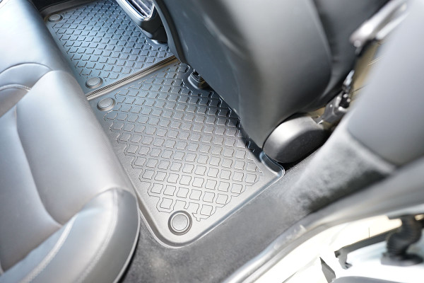 Protezione >  La miscela in termoplastica TPE di alta qualità e la forma a rialzo assicurano una protezione completa. I bordi del set sono alti per prevenire la fuoriuscita di liquidi e della sporcizia, mantenendoli all'interno dei tappetini. Il piano sottostante rimane così asciutto e pulito, eliminando il rischio di cattivi odori e muffe. Designed in Italy, Made in EU. I tappetini sono appositamente progettati per resistere ai raggi UV, alle temperature elevate e ai graffi.