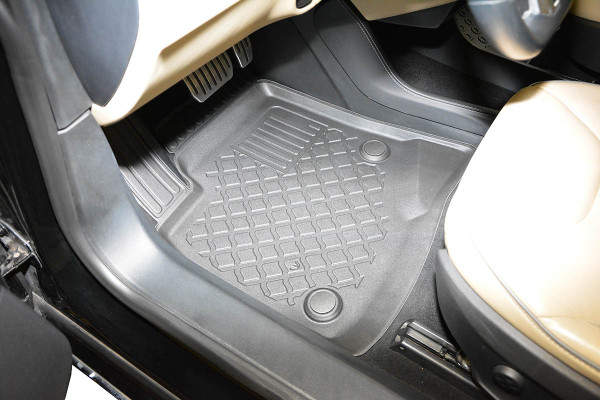 Protezione >  La miscela in termoplastica TPE di alta qualità e la forma a rialzo assicurano una protezione completa. I bordi del set sono alti per prevenire la fuoriuscita di liquidi e della sporcizia, mantenendoli all'interno dei tappetini. Il piano sottostante rimane così asciutto e pulito, eliminando il rischio di cattivi odori e muffe. Designed in Italy, Made in EU. I tappetini sono appositamente progettati per resistere ai raggi UV, alle temperature elevate e ai graffi.