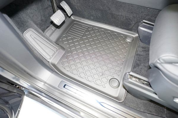 Protezione >  La miscela in termoplastica TPE di alta qualità e la forma a rialzo assicurano una protezione completa. I bordi del set sono alti per prevenire la fuoriuscita di liquidi e della sporcizia, mantenendoli all'interno dei tappetini. Il piano sottostante rimane così asciutto e pulito, eliminando il rischio di cattivi odori e muffe. Designed in Italy, Made in EU. I tappetini sono appositamente progettati per resistere ai raggi UV, alle temperature elevate e ai graffi.