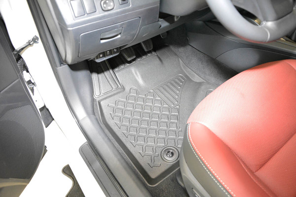 Protezione >  La miscela in termoplastica TPE di alta qualità e la forma a rialzo assicurano una protezione completa. I bordi del set sono alti per prevenire la fuoriuscita di liquidi e della sporcizia, mantenendoli all'interno dei tappetini. Il piano sottostante rimane così asciutto e pulito, eliminando il rischio di cattivi odori e muffe. Designed in Italy, Made in EU. I tappetini sono appositamente progettati per resistere ai raggi UV, alle temperature elevate e ai graffi.