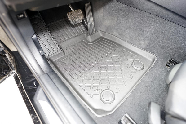 Protezione >  La miscela in termoplastica TPE di alta qualità e la forma a rialzo assicurano una protezione completa. I bordi del set sono alti per prevenire la fuoriuscita di liquidi e della sporcizia, mantenendoli all'interno dei tappetini. Il piano sottostante rimane così asciutto e pulito, eliminando il rischio di cattivi odori e muffe. Designed in Italy, Made in EU. I tappetini sono appositamente progettati per resistere ai raggi UV, alle temperature elevate e ai graffi.